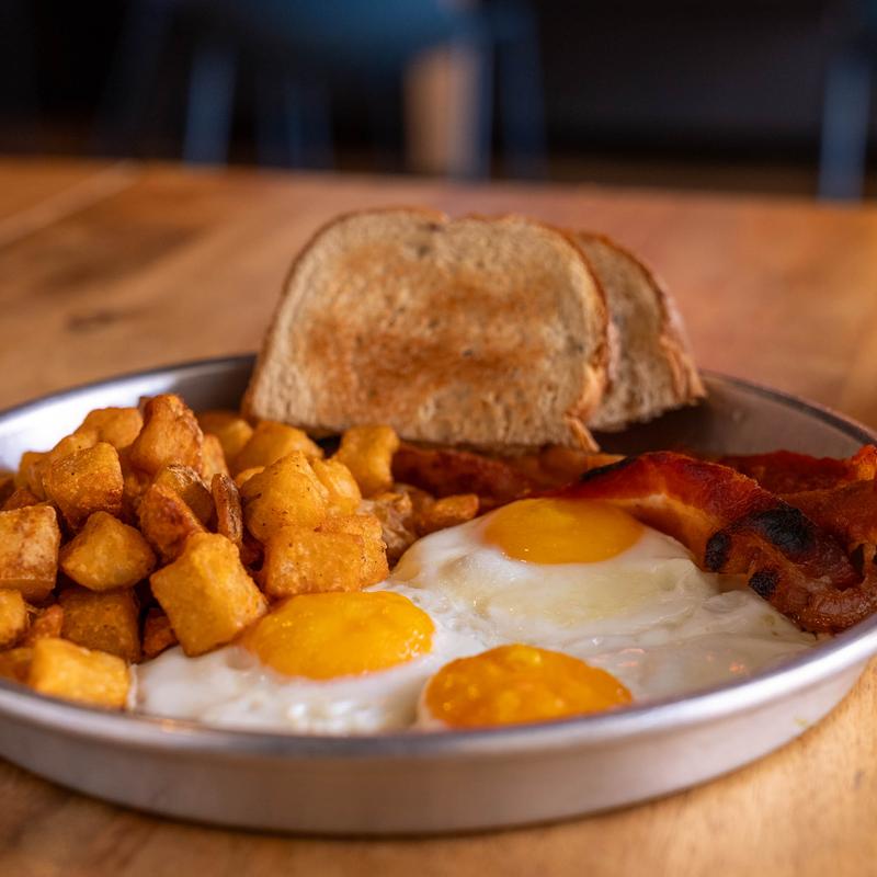 Eggs, bacon, home fries (onions & peppers), sausage gravy, cheddar cheese