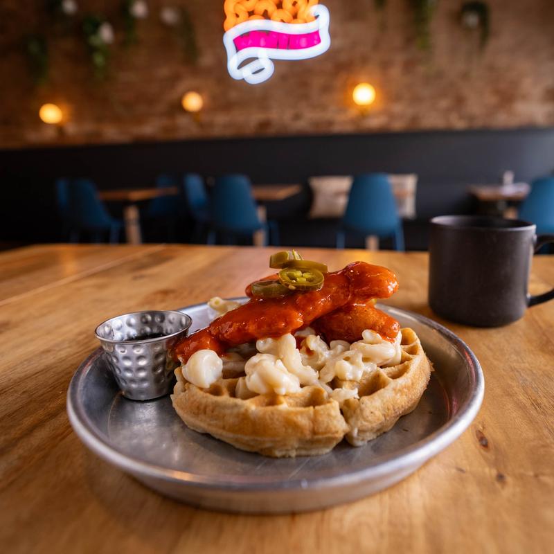 Fried chicken tossed in red hot sauce, white cheddar mac & cheese, fresh jalapenos, spicy syrup