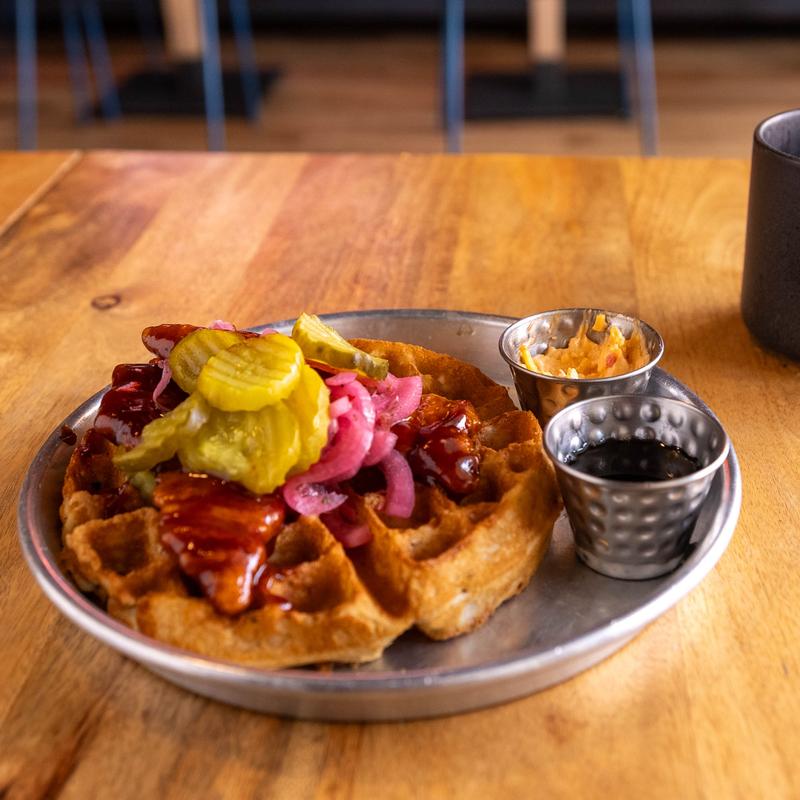 BBQ fried chicken, sweet pickles, pickled onions, pimento cheese, spicy syrup